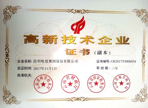 2017年12月,昆明電纜集團股份有限公司再次通過了高新技術企業(yè)的認定,被云南省科學技術廳、云南省財政廳、云南省國家稅務局、云南省地方稅務局認定為“高新技術企業(yè)”。